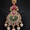 A delicate gold-tone maang tikka featuring a flame-inspired teardrop silhouette. The pendant is intricately layered with shimmering white stones forming a radiant frame around a bold blush-pink center stone. The slender chain is adorned with crystal-studded leaf motifs, enhancing its graceful flow. A single pearl drop at the base adds softness and refined charm. Perfect for elegant bridal styling or festive occasions, this piece offers a balanced blend of sparkle and sophistication.