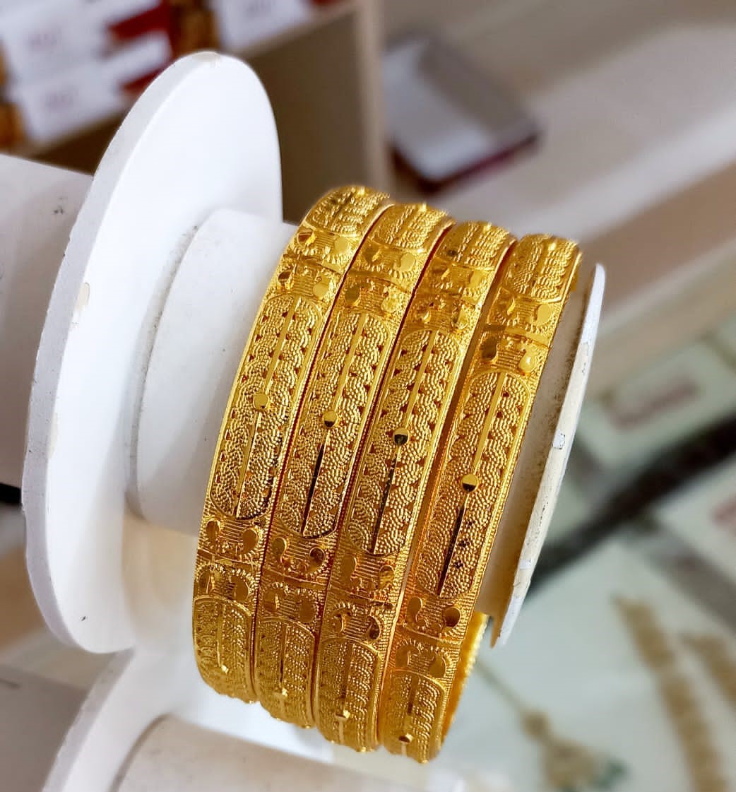 This elegant set of gold-tone fashion bangles features beautifully detailed textured patterns that create a rich and traditional look. The surface is adorned with intricate engraved motifs and geometric elements that give the bangles depth and a refined handcrafted appearance.
