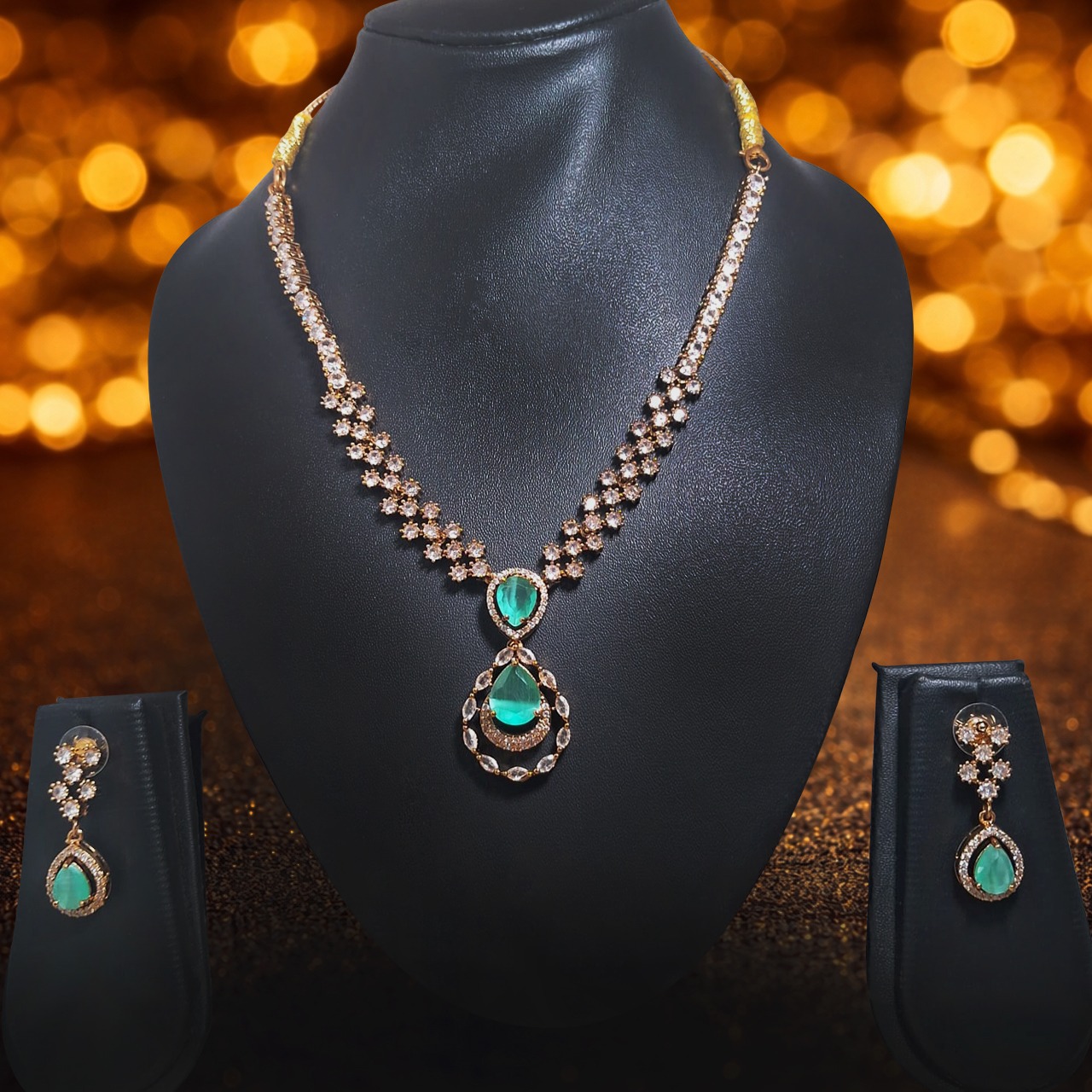 The set is completed with matching drop earrings that mirror the pendant’s design, making it perfect for weddings, evening events, and festive celebrations. With its timeless beauty and elegant gemstone accents, this necklace set adds a touch of refined glamour to any outfit.