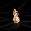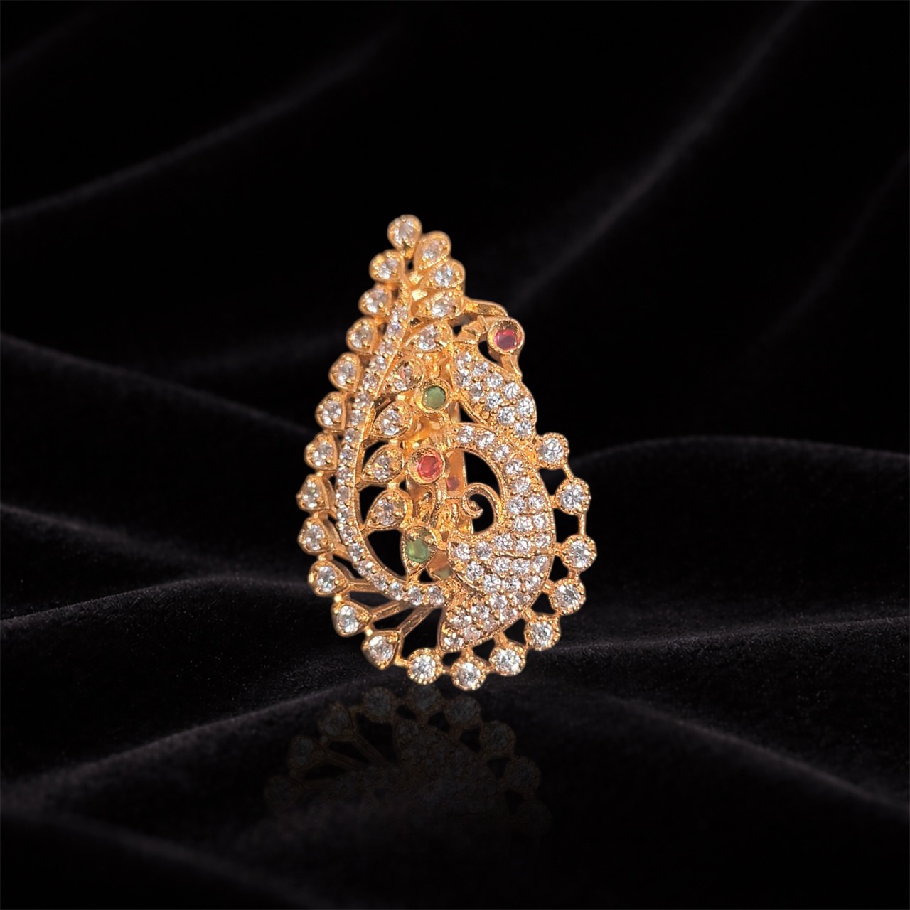 Intricately designed gold-finish saree pin inspired by a classic peacock motif, featuring shimmering white crystal stones with subtle pink and green stone highlights. The detailed craftsmanship and circular patterned design add a rich traditional look while ensuring a secure hold for saree pleats. Ideal for festive wear, weddings, and ethnic occasions.