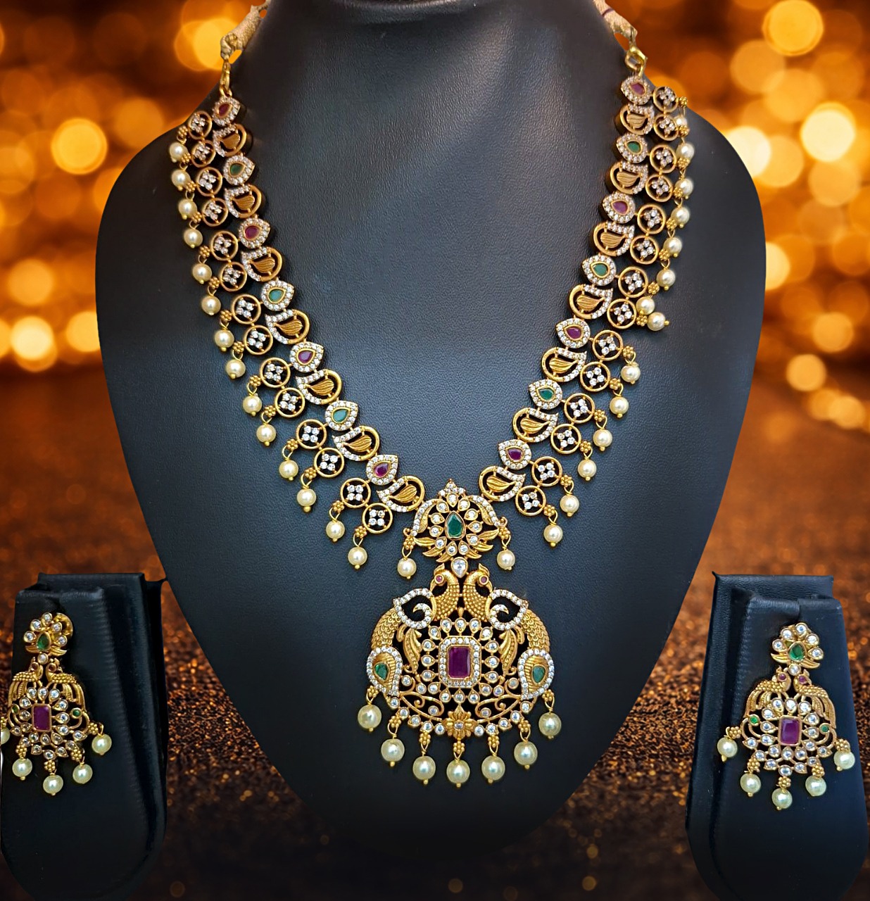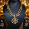Exquisitely designed gold-finish temple-style necklace set featuring intricate traditional motifs adorned with shimmering white crystal stones and accented with green and red stones. The grand pendant is enhanced with delicate pearl drops, adding a rich and regal appeal. Paired with matching earrings, this statement set is ideal for weddings, bridal wear, and festive celebrations.