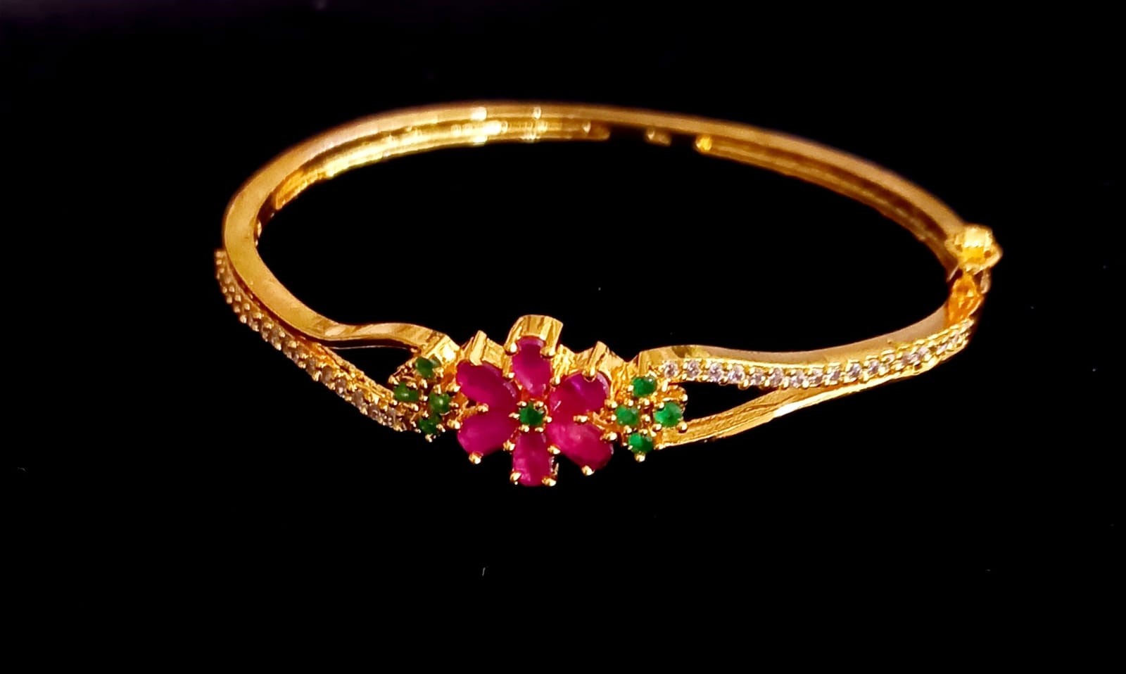 Designed with a gold-plated finish, this bracelet features a floral design at the center with red stones highlighted by small green stone detailing. Stone work along the band adds a traditional look. Suitable for festive wear, traditional functions, and ethnic styling.