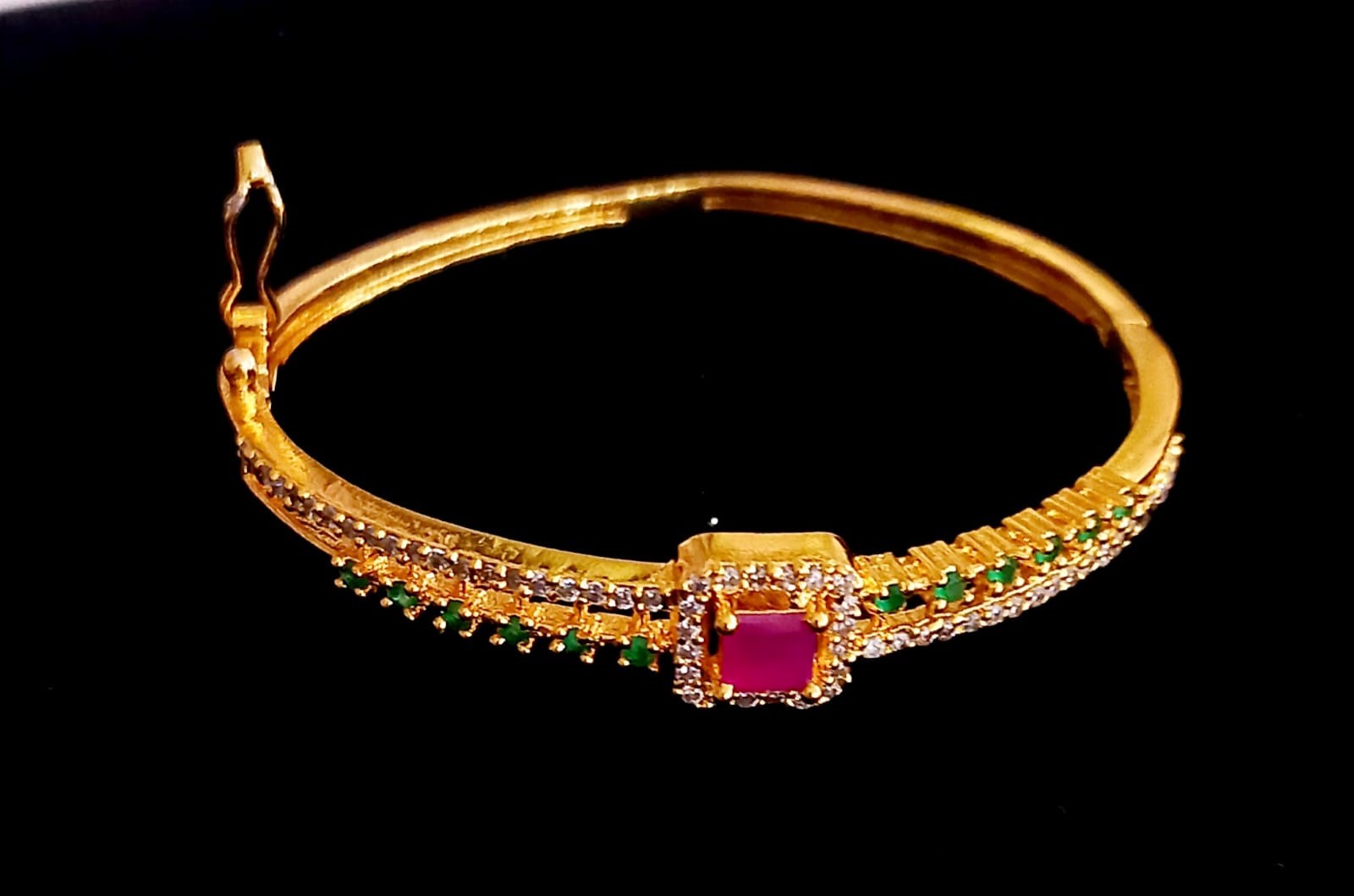 Designed with a gold-plated finish, this bracelet features a square-shaped center stone highlighted with small stone detailing. The design is enhanced with green stones along the band, giving it a traditional and elegant look. Suitable for festive wear, traditional functions, and ethnic styling.