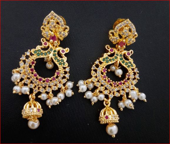 Featuring white and pink stones set in a delicate green motif, finished with graceful pearl hangings and a bell-shaped charm, these earrings embody the spirit of festive tradition and refined artistry.