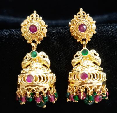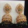 Inspired by South Asian heritage, these elegant jhumkas feature a floral crown set with rich red stones, cascading into a temple bell-style design adorned with red and green accents.
