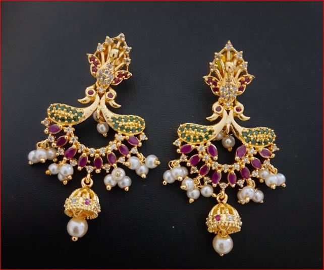 Celebrate grace and tradition with the Mayura Regal Drops, featuring intricately carved peacocks perched atop a radiant circular base adorned with pearls and colorful stones.