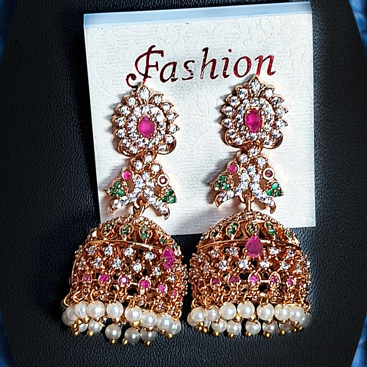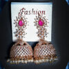 The dome-shaped jhumka is finely crafted with delicate lattice detailing, highlighted by pink stone embellishments and finished with a row of classic pearl drops for graceful movement.