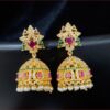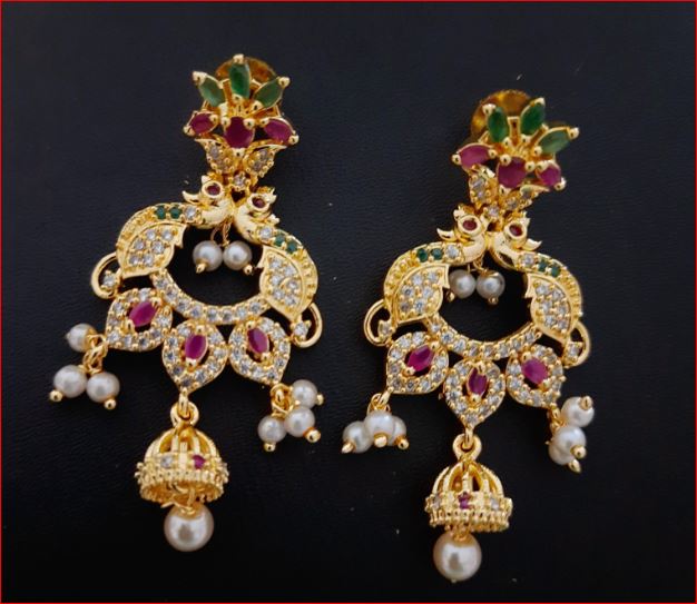 Rajkumari Peacock Drops epitomize regal beauty with their intricate peacock design adorned with sparkling white stones and vibrant green and red gems.