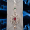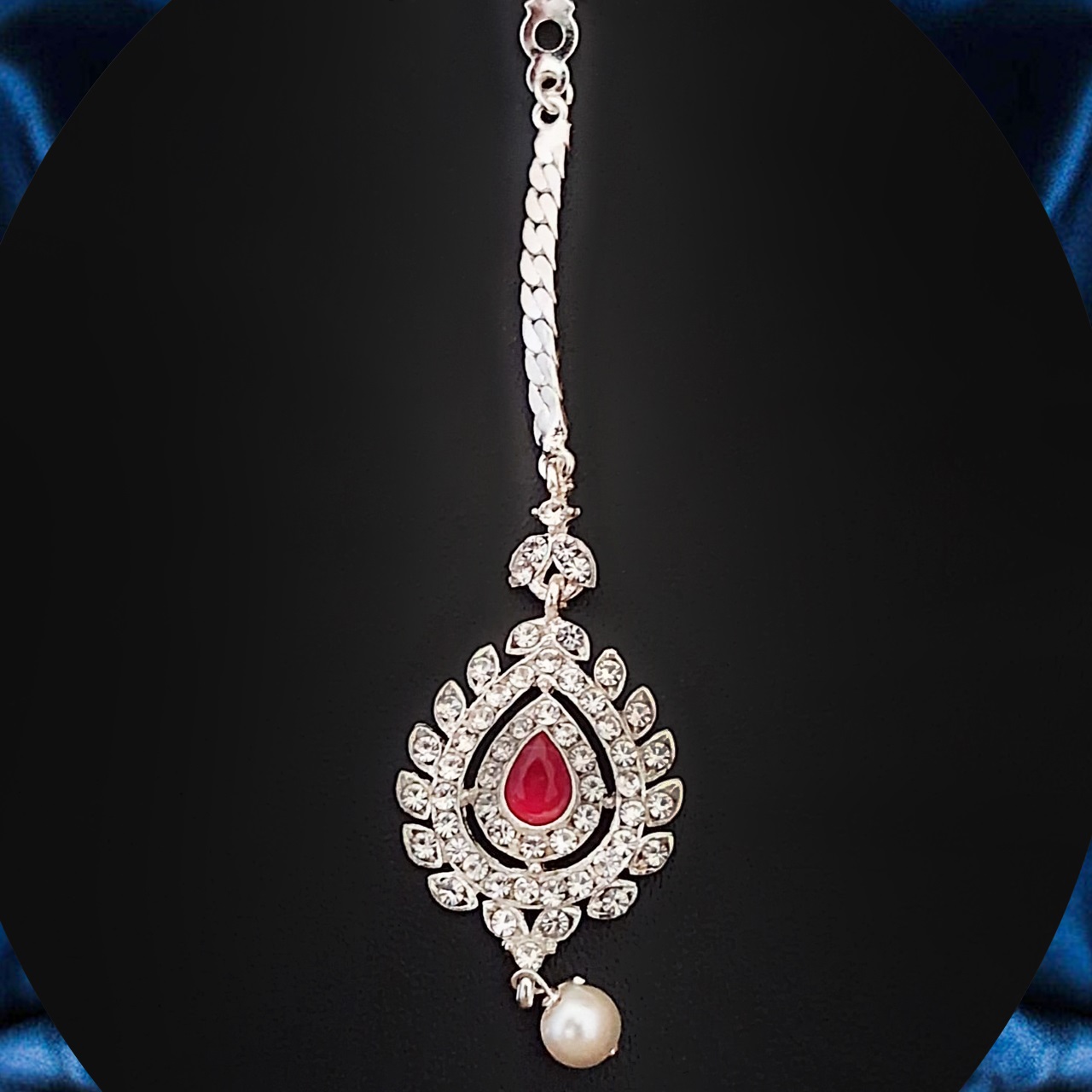 A sleek and elegant silver-tone maang tikka crafted in a distinctive eye-shaped design. The pendant features a rich ruby-red teardrop stone at the center, surrounded by dual layers of sparkling white crystals that enhance its radiant appeal. Delicate leaf-like crystal accents frame the outer edge, creating a refined and symmetrical look. The piece is attached to a slim chain and finished with a single pearl drop for a graceful touch.