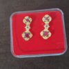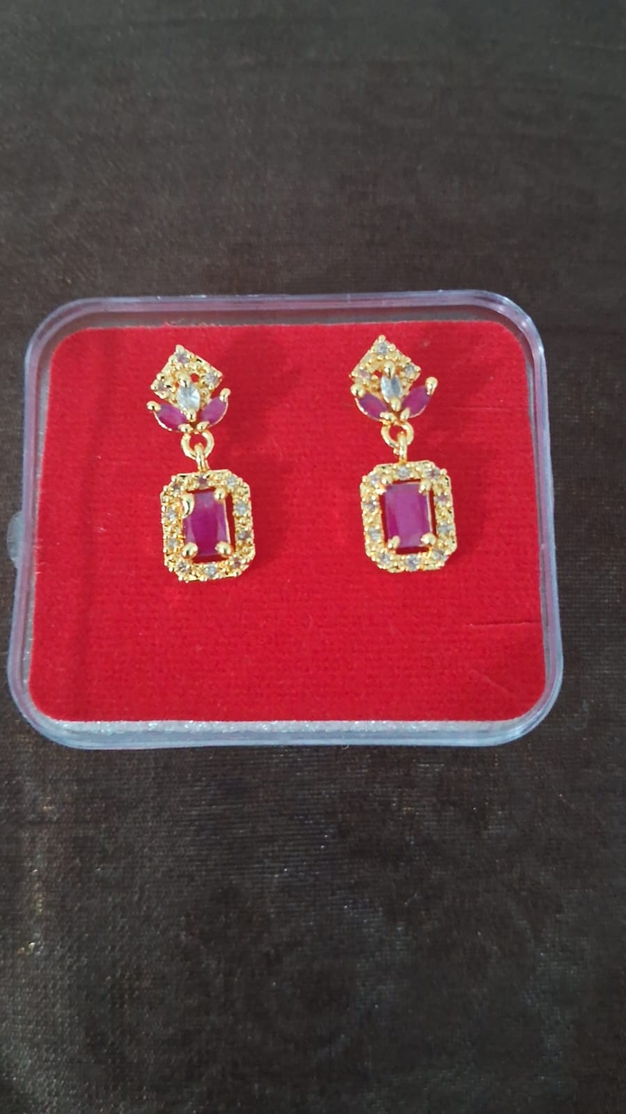 Elegant gold-tone drop earrings featuring radiant ruby-colored stones framed with shimmering crystals. Perfect for weddings, festive occasions, or evening wear, these earrings add a royal touch to any outfit.