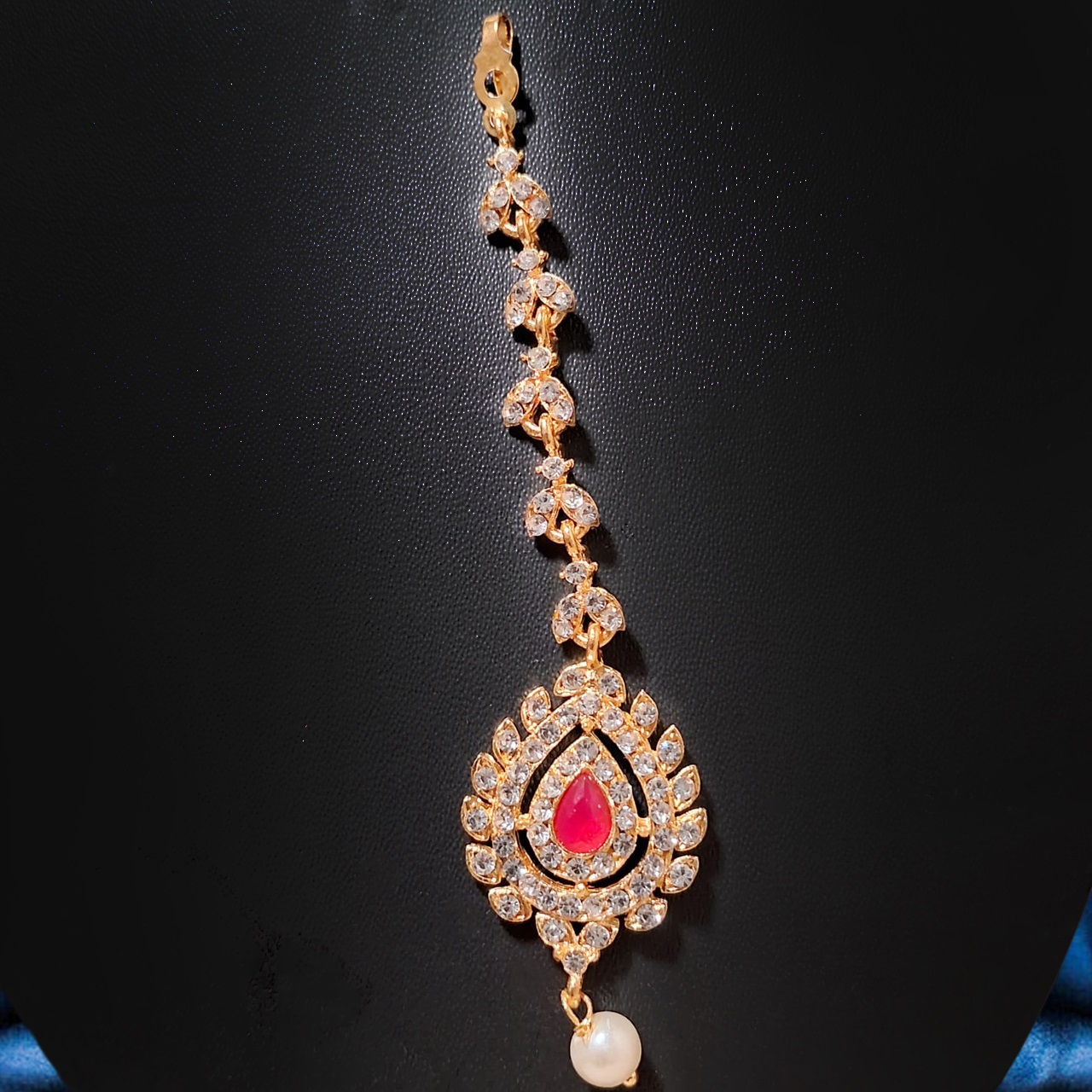 A radiant gold-tone maang tikka crafted in a captivating eye-shaped silhouette. The pendant features a vivid ruby-pink teardrop stone at the center, encircled by concentric layers of sparkling white crystals. The outer frame is adorned with petal-like marquise stones, creating a sunburst-inspired effect. The finely detailed crystal chain enhances its luxurious appeal, while a single pearl drop at the end adds a graceful finishing touch.