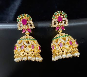 Rooted in cultural elegance, these ornate jhumkas are inspired by traditional temple bells and adorned with intricate gold patterns.